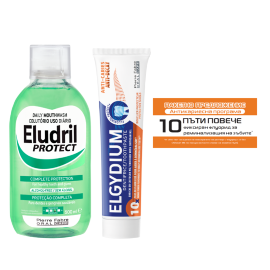 ЕЛУДРИЛ КОМПЛЕКТ ВОДА ЗА УСТА ПРОТЕКТ 500МЛ+ЕЛГИДИУМ ПАСТА ЗА ЗЪБИ АНТИКАРИЕС 75МЛ