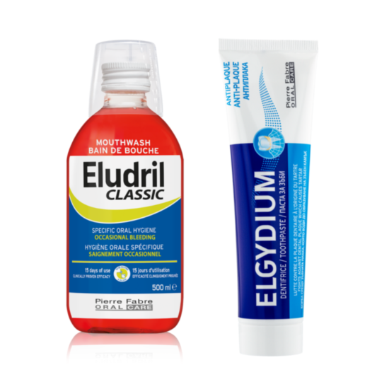 ЕЛУДРИЛ КОМПЛЕКТ ВОДА ЗА УСТА КЛАСИК 500МЛ+ЕЛГИДИУМ ПАСТА ЗА ЗЪБИ АНТИПЛАКА 100МЛ
