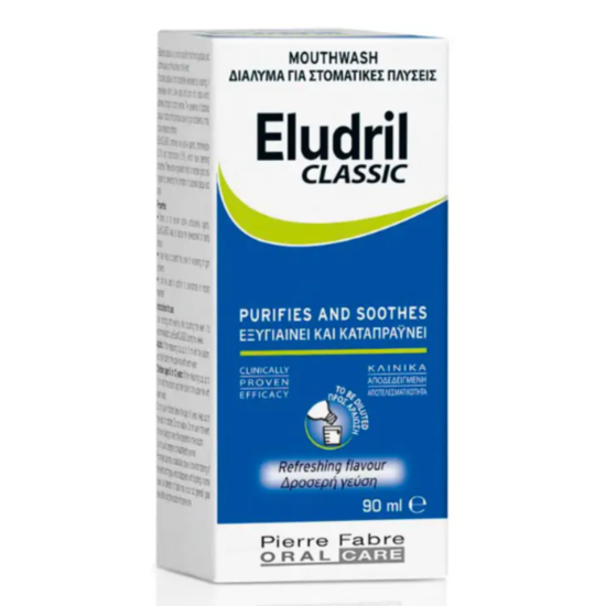 ЕЛУДРИЛ ВОДА ЗА УСТА 90 МЛ е вода за уста, която спомага за поддържане на добра орална хигиена, успокоява раздразнени и кървящи венци и се бори с натрупването на зъбна плака. Нейната формула, включваща хлорхексидин диглюконат (0.10%) и хлорoбутанол (0.5%), осигурява антибактериално и успокояващо действие. Тя помага и за почистване на устната кухина след пародонтална терапия или като допълнение към нея, както и в специфични ситуации, като например: дразнене на венците, свързано с натрупване на плака, носене на брекети или импланти.