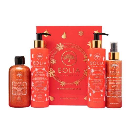 EOLIA КОМПЛЕКТ MELOMAKARONO ЛОСИОН ЗА ТЯЛО 250МЛ+ДУШ ГЕЛ 250МЛ+МИСТ С БЛЯСЪК 150МЛ+СКРАБ 250МЛ