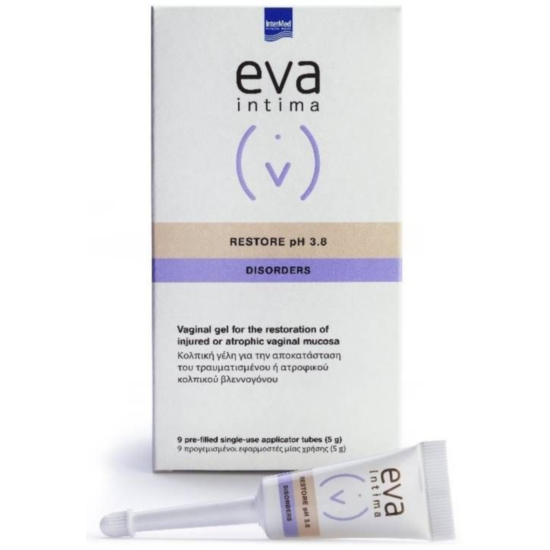 Гелът Eva Intima Restore pH 3.8 спомага за образуването на защитен филм върху вагиналната лигавица, който подобрява регенерацията на вагиналния епител, като същевременно поддържа естествената влага във влагалището, главно благодарение на хиалуроновата киселина с нейната силна хидрофилност. Формулата съдържа внимателно подбрани билкови екстракти (лайка, алое, невен, азиатска центела и чаено дърво) и биоеколия, които имат овлажняващи свойства и осигуряват незабавно успокояващо действие срещу симптомите на вагинална сухота, като усещане за парене или сърбеж. В допълнение към това млечната киселина допринася за регулиране на вагиналното рН до нормалната му киселинна стойност. Продуктът спомага за повишаване на регенеративната способност на вагиналната лигавица и благоприятства бързото възстановяване при атрофични и дистрофични състояния. Най-честите причини за тях са менопаузата или преждевременната овариална недостатъчност, както и онкологично лечение и/ или гинекологични процедури.