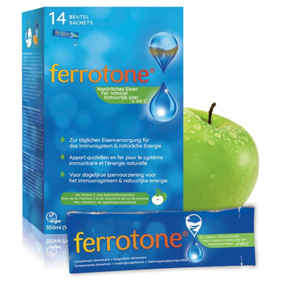 е хранителна добавка под формата на сашета, обогатена с ябълков сок и Витамин С, която доставя на организма желязо от естествен източник. Дневният прием на 1 саше покрива нуждите от желязо и Витамин С. Нормалната резорбция на желязо от храната е от 5 до 20%, а поради по-високата усвояемост (40%) на железният (II) сулфат във Феротон, количеството в едно саше покрива дневната нужда. Ferrotone съдържа изцяло натурална, богата на желязо вода от планините на Уелс. Желязото е важен микроелемент за правилното функциониране на организма, тъй като участва в процесите на кръвотворене (съставна част на хемоглобина), транспорта на кислород към тъканите, както и за нормалната функция на имунната система. При липса на достатъчно желязо в организма, се развиват недоимъчни състояния и желязодефицитна анемия. Включеното желязо във Феротон е лесно усвоимо и има много добра поносимост, а Витамин С увеличава неговото усвояване. Дневните нужди за деца и мъже са от 1 до 1,5 mg на ден, а за жени - 2 mg дневно. Продуктът не съдържа консерванти и добавки. Подходящ е за деца над 3 годишна възраст. Предлага се в удобна опаковка с 14 готови за употреба сашета, всяко по 25 мл.