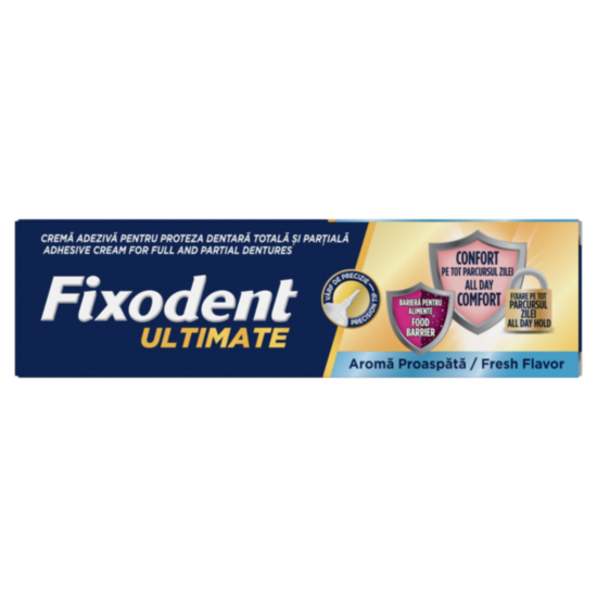 FIXODENT COMPLETE ULTIMATE FRESH Фиксодент Къмплийт Ултимейт Фреш Фиксиращо лепило за протези. Лепилото образува възглавничка между венците и протезите като ги предпазва от раздразнение и осигурява комфорти през целия ден. Задържа и фиксира, предотвратява разместване на протезата и навлизане на храна под нея. Благодарение на ултратънкият накрайник, лепилото се нанася лесно и прецизно. Мекият и приятен ментов вкус оставя дълготрайно усещане за свежест. Подходящо за цели или частични протези.