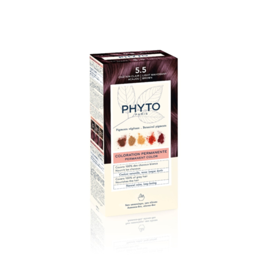ФИТО ФИТОКОЛОР БОЯ ЗА КОСА №5.5 СВЕТЪЛ МАХАГОН e първата линия бои за коса, която съчетава високи технологии и ефикасни тинктурни растителни екстракти без съдържание на амоняк, PPD (пара-фенилендиамин) и резорцин. Формула с висока концентрация на растителни пигменти (до 74% в зависимост от цвета) за интензивен и естествен цвят и блясък. Доказана 100% покривност на белите коси. Иновативна формула, която осигурява дълготраен цвят като ограничава до минимум риска от алергични реакции и осигурява максимална грижа за скалпа и косата.