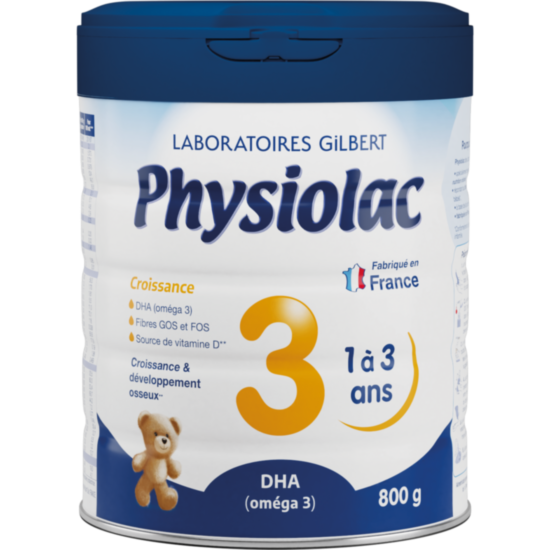 Physiolac 3 е мляко на прах за малки деца от 1 до 3 години, произведено във Франция от 100% френско обезмаслено мляко.Формулата на Physiolac 3 e специално разработена и валидирана от експерти по хранене на кърмачета, задоволяваща техните специфични хранителни нужди след 12 месечна възраст. Може да се използва заедно със захранващи храни. Съдържа всички основни съставки, необходими за осигуряване на здравословно развитие и растеж на детето. Източник на Витамин D необходим за нормалното развиване на костната структура. Не съдържа фруктоза, за да не се привиква към сладкия вкус. С аромат на ванилия.