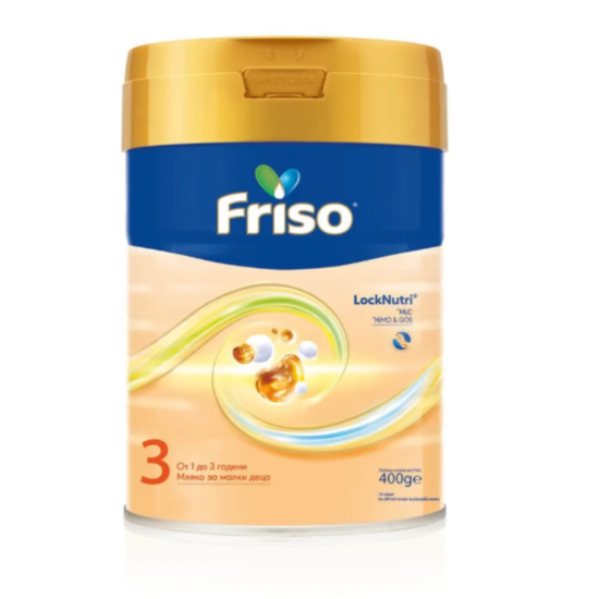 Фризо 3 на марката Фризо е преходно мляко за здрави кърмачета с повишен риск от алергия към протеина на кравето мляко. Не трябва да се използва при кърмачета с доказана хранителна алергия. Friso 3 може да се използва след навършвае на 6-месечна възраст , като част от разнообразното хранене на кърмачето. Моля консултирайте се с Вашия лекар относно храненето на Вашето бебе, тъй като кърмачетата се нуждаят от допълнителни храни освен млякото. Предлага се вопаковка от 400 г