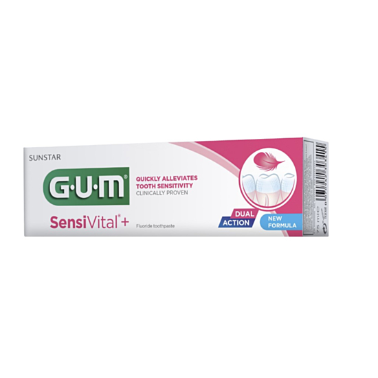 ГЪМ 07699 ПАСТА ЗА ЧУВСТВИТЕЛНИ ЗЪБИ СЕНСИВИТАЛ + 75МЛ А - Пастата за зъби GUM SensiVital® + предлага бързо и дълготрайно облекчаване на чувствителните зъби, предпазва и укрепва емайла, както и десенсибилизира нервите. Помага за предотвратяване на кариес благодарение на уникалната комбинация от екстракти от флуорид, изомалт и портокалова кора. Грижи се за предотвратяване отдръпването на венците и осигурява нежна грижа за устните тъкани благодарение на уникално нежен профил, без алкохол, който намалява риска от раздразнения. Приятен аромат на мента за свежо, чисто усещане. За възрастни и деца над 7 години.