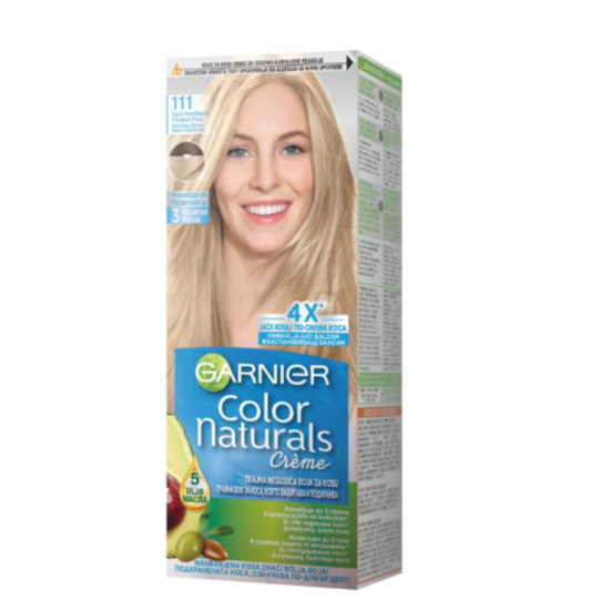ГАРНИЕ БОЯ ЗА КОСА COLOR NATURALS 111 много светло пепеляво рус - Подхранваща крем-боя за коса, която покрива на 100% белите коси, като същевременно ги дарява с интензивен и блестящ цвят. Трайната боя за коса на Гарниер е обогатена със зехтин, който защитава и подхранва косата, като ѝ придава копринена мекота и сияен блясък. Боята позволява интензивен и блестящ цвят без да уврежда косата. Включения балсам съдържа масла от маслина, карите и авокадо, които ефективно защитават косъма от корена до върха. Маслата подхранват корените и кожата на главата, съхраняват естествената им влага и правят косата силна, мека и с ослепителен блясък.