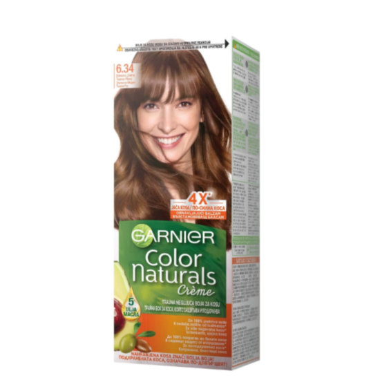 ГАРНИЕ БОЯ ЗА КОСА COLOR NATURALS 6.34 златисто меден тъмно рус - Подхранваща крем-боя за коса, която покрива на 100% белите коси, като същевременно ги дарява с интензивен и блестящ цвят. Трайната боя за коса на Гарниер е обогатена със зехтин, който защитава и подхранва косата, като ѝ придава копринена мекота и сияен блясък. Боята позволява интензивен и блестящ цвят без да уврежда косата. Включения балсам съдържа масла от маслина, карите и авокадо, които ефективно защитават косъма от корена до върха. Маслата подхранват корените и кожата на главата, съхраняват естествената им влага и правят косата силна, мека и с ослепителен блясък.