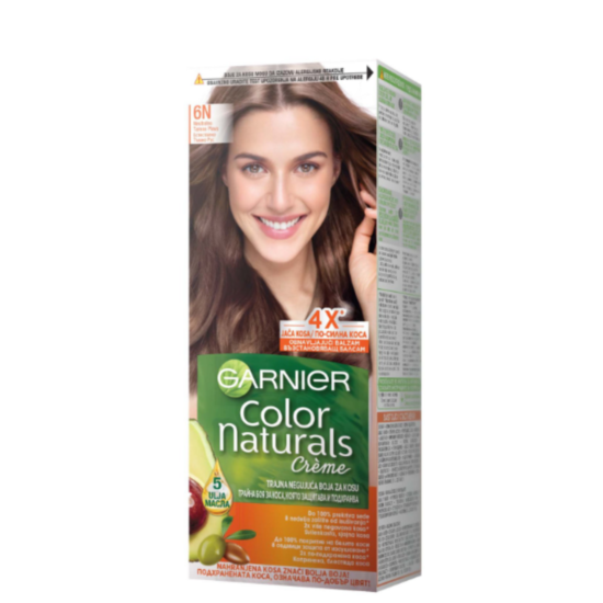 ГАРНИЕ БОЯ ЗА КОСА COLOR NATURALS 6N естествено тъмно рус - Подхранваща крем-боя за коса, която покрива на 100% белите коси, като същевременно ги дарява с интензивен и блестящ цвят. Трайната боя за коса на Гарниер е обогатена със зехтин, който защитава и подхранва косата, като ѝ придава копринена мекота и сияен блясък. Боята позволява интензивен и блестящ цвят без да уврежда косата. Включения балсам съдържа масла от маслина, карите и авокадо, които ефективно защитават косъма от корена до върха. Маслата подхранват корените и кожата на главата, съхраняват естествената им влага и правят косата силна, мека и с ослепителен блясък.