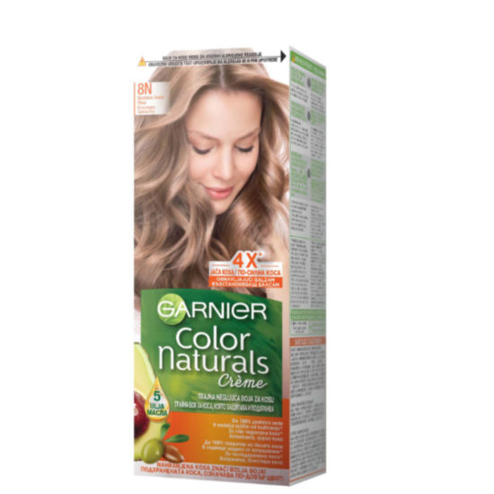 ГАРНИЕ БОЯ ЗА КОСА COLOR NATURALS 8N естествено светло рус - Подхранваща крем-боя за коса, която покрива на 100% белите коси, като същевременно ги дарява с интензивен и блестящ цвят. Трайната боя за коса на Гарниер е обогатена със зехтин, който защитава и подхранва косата, като ѝ придава копринена мекота и сияен блясък. Боята позволява интензивен и блестящ цвят без да уврежда косата. Включения балсам съдържа масла от маслина, карите и авокадо, които ефективно защитават косъма от корена до върха. Маслата подхранват корените и кожата на главата, съхраняват естествената им влага и правят косата силна, мека и с ослепителен блясък.