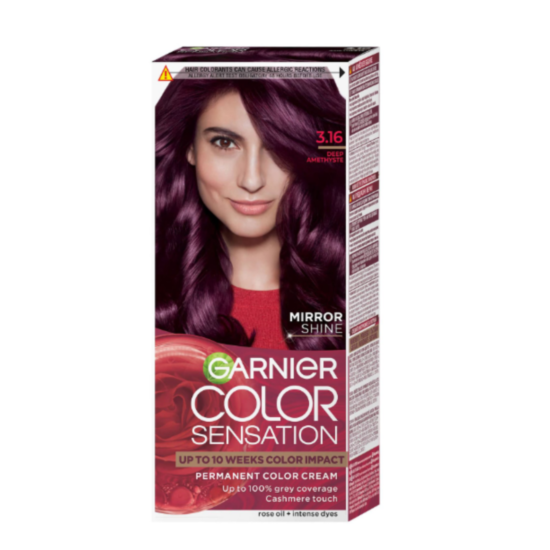 ГАРНИЕ БОЯ ЗА КОСА COLOR SENSATION 3.16 аметист - Боя за коса с високо устойчиви пигменти за постигане на най-интензивни и дълготрайни нюанси. Боята за коса на Гарниер е рзкошна разкрасяваща грижа, обогатена с екстракт от седеф, който дарява косата с копринена мекота при допир и огледален блясък. Продукта осигурява оптимално покритие на белите коси. По време на боядисване, боята оставя приятен аромат. Иновативната боя за коса е с ниско съдържание на амоняк.