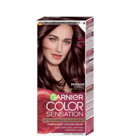 ГАРНИЕ БОЯ ЗА КОСА COLOR SENSATION 4.15 леден кестен - Боя за коса с високо устойчиви пигменти за постигане на най-интензивни и дълготрайни нюанси. Боята за коса на Гарниер е рзкошна разкрасяваща грижа, обогатена с екстракт от седеф, който дарява косата с копринена мекота при допир и огледален блясък. Продукта осигурява оптимално покритие на белите коси. По време на боядисване, боята оставя приятен аромат. Иновативната боя за коса е с ниско съдържание на амоняк.