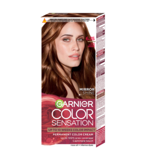 ГАРНИЕ БОЯ ЗА КОСА COLOR SENSATION 6.35 шик кестеняв - Боя за коса с високо устойчиви пигменти за постигане на най-интензивни и дълготрайни нюанси. Боята за коса на Гарниер е рзкошна разкрасяваща грижа, обогатена с екстракт от седеф, който дарява косата с копринена мекота при допир и огледален блясък. Продукта осигурява оптимално покритие на белите коси. По време на боядисване, боята оставя приятен аромат. Иновативната боя за коса е с ниско съдържание на амоняк.