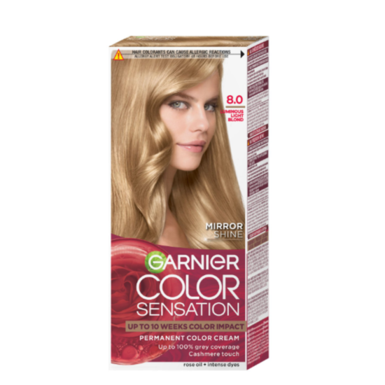 ГАРНИЕ БОЯ ЗА КОСА COLOR SENSATION 8.0 светло рус - Боя за коса с високо устойчиви пигменти за постигане на най-интензивни и дълготрайни нюанси. Боята за коса на Гарниер е рзкошна разкрасяваща грижа, обогатена с екстракт от седеф, който дарява косата с копринена мекота при допир и огледален блясък. Продукта осигурява оптимално покритие на белите коси. По време на боядисване, боята оставя приятен аромат. Иновативната боя за коса е с ниско съдържание на амоняк.
