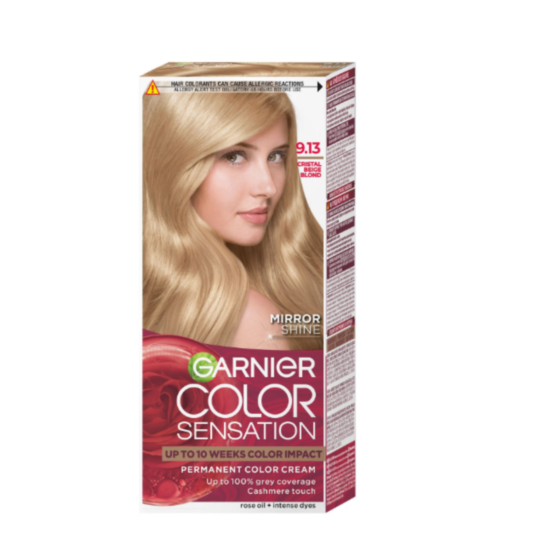 ГАРНИЕ БОЯ ЗА КОСА COLOR SENSATION 9.13 кристално рус - Боя за коса с високо устойчиви пигменти за постигане на най-интензивни и дълготрайни нюанси. Боята за коса на Гарниер е рзкошна разкрасяваща грижа, обогатена с екстракт от седеф, който дарява косата с копринена мекота при допир и огледален блясък. Продукта осигурява оптимално покритие на белите коси. По време на боядисване, боята оставя приятен аромат. Иновативната боя за коса е с ниско съдържание на амоняк.