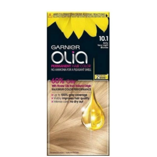 ГАРНИЕ БОЯ ЗА КОСА ОЛИА 10.1 Ashy Very Very Blond е трайна боя за коса, без съдържание на амоняк, базирана на комплекс от 60% концентрирани растителни масла, които не просто подхранват, но и разкриват цвета от сърцевината на косъма. Боята подхранва корените и кожата на главата, съхранява естествената им влага и прави косата блестяща, силна и изпълнена с живот. Уникалната формула съдържа масла от камелия (Camellia), слънчоглед (Sunflower), пасифлора (Passion Flower) и ливадина (Limnanthes Alba). Тези масла са били използвани в продължение на векове за грижа и защита на косъма и скалпа. Продуктът притежава изключителна покривност и наситеност на цвета, като покрива до 100% сивите коси и изсветлява до 3 тона от основния цвят. Кадифено гладката текстура на боята се нанася лесно и не се разтича. Боята подобрява видимо състоянието на косата, оставяйки я блестяща и мека, с невероятно наситен цвят за дълго време. Консистенцията на Olia има деликатен аромат на цветя и щади скалпа.