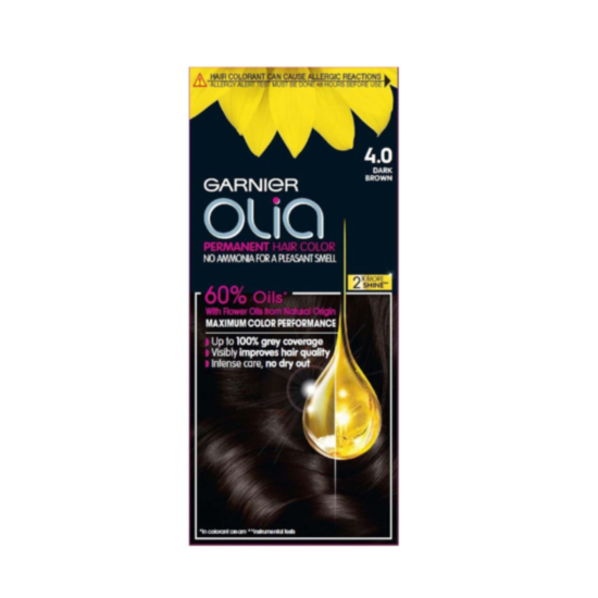 ГАРНИЕ БОЯ ЗА КОСА ОЛИА 4.0 Dark Brown * е трайна боя за коса, без съдържание на амоняк, базирана на комплекс от 60% концентрирани растителни масла, които не просто подхранват, но и разкриват цвета от сърцевината на косъма. Боята подхранва корените и кожата на главата, съхранява естествената им влага и прави косата блестяща, силна и изпълнена с живот. Уникалната формула съдържа масла от камелия (Camellia), слънчоглед (Sunflower), пасифлора (Passion Flower) и ливадина (Limnanthes Alba). Тези масла са били използвани в продължение на векове за грижа и защита на косъма и скалпа. Продуктът притежава изключителна покривност и наситеност на цвета, като покрива до 100% сивите коси и изсветлява до 3 тона от основния цвят. Кадифено гладката текстура на боята се нанася лесно и не се разтича. Боята подобрява видимо състоянието на косата, оставяйки я блестяща и мека, с невероятно наситен цвят за дълго време. Консистенцията на Olia има деликатен аромат на цветя и щади скалпа.