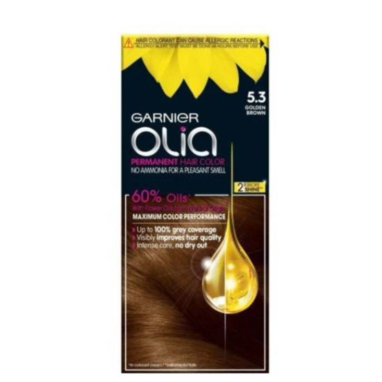 ГАРНИЕ БОЯ ЗА КОСА ОЛИА 5.3 Golden Brown е трайна боя за коса, без съдържание на амоняк, базирана на комплекс от 60% концентрирани растителни масла, които не просто подхранват, но и разкриват цвета от сърцевината на косъма. Боята подхранва корените и кожата на главата, съхранява естествената им влага и прави косата блестяща, силна и изпълнена с живот. Уникалната формула съдържа масла от камелия (Camellia), слънчоглед (Sunflower), пасифлора (Passion Flower) и ливадина (Limnanthes Alba). Тези масла са били използвани в продължение на векове за грижа и защита на косъма и скалпа. Продуктът притежава изключителна покривност и наситеност на цвета, като покрива до 100% сивите коси и изсветлява до 3 тона от основния цвят. Кадифено гладката текстура на боята се нанася лесно и не се разтича. Боята подобрява видимо състоянието на косата, оставяйки я блестяща и мека, с невероятно наситен цвят за дълго време. Консистенцията на Olia има деликатен аромат на цветя и щади скалпа.