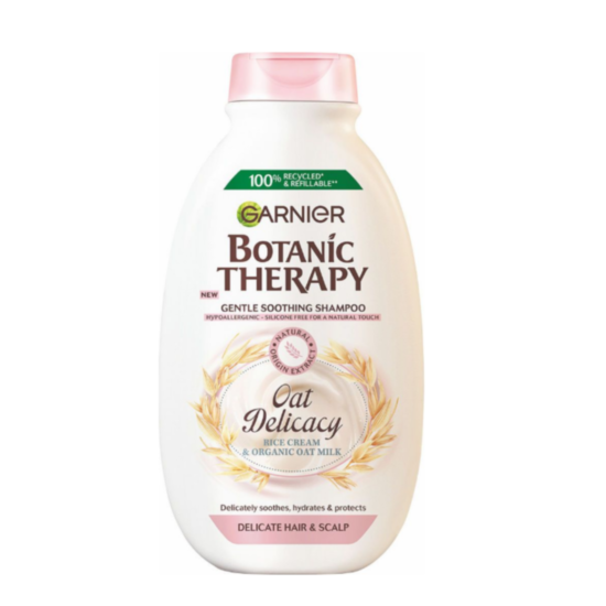 ГАРНИЕ БОТАНИК ТЕРАПИ ШАМПОАН С ОВЕСЕНО МЛЯКО ЗА ЧУВСТВИТЕЛЕН СКАЛП 250МЛ e успокояващ шампоан за деликатна коса и скалп. Шампоанът почиства, успокоява и същевременно хидратира чувствителната кожа на главата. Неговата формула е обогатена с овесено мляко, което успокоява и най-раздразнената кожа. То незабавно облекчава сърбящия скалп. Вложен е оризов крем, който интензивно хидратира и подхранва косата, като я прави мека и блестяща.