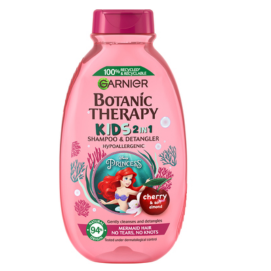 ГАРНИЕ БОТАНИК ТЕРАПИ ШАМПОАН ЗА ДЕЦА 2В1 ЧЕРЕША И БАДЕМ 250МЛ е шампоан за деца, който е подходящ за всеки тип коса. Има деликатна хипоалергенна формула, която не дразни очите и е обогатен с масло от бадем, което подхранва косата и същевременно ѝ придава блясък. В допълнение към състава е вложен екстракт от череша за повече мекота. Шампоанът не съдържа силикони и е преминал педиатричен контрол.