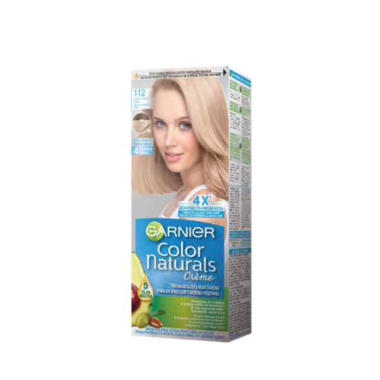 ГАРНИЕ БОЯ ЗА КОСА COLOR NATURALS 112 е подхранваща боя за коса, която покрива до 100% белите коси. Тя дарява с дълготраен, интензивен и блестящ цвят. Боята е обогатена със зехтин, който защитава и подхранва косата, като ѝ придава копринена мекота и блясък. Включените масла от маслина, карите и авокадо, ефективно защитават косъма от корена до върха, подхранват го и го хидратират. Благодарение на тях, косата става по-силна, копринено мека и по-сияйна.