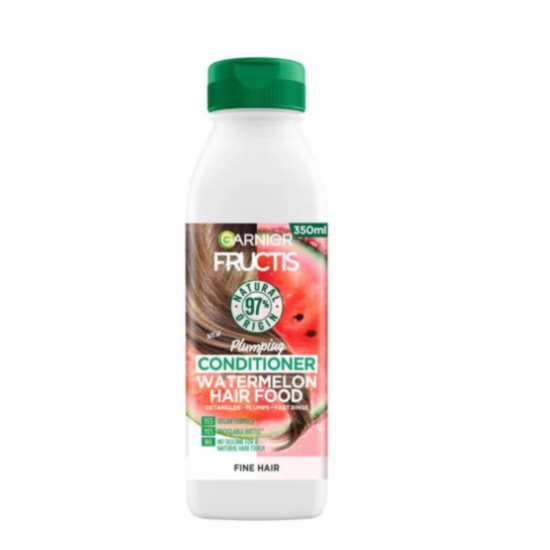 ГАРНИЕ ФРУКТИС HAIR FOOD БАЛСАМ С ДИНЯ 350МЛ е балсам за тънка, фина и слаба коса. Той е обогатен с диня и нар и съдържа съставки от натурален произход. Текстурата му моментално прониква в косъма и прави косата лесна за разресване и хидратирана. Балсамът е биоразградим и дерматологично тестван продукт, с опаковка от рециклирана пластмаса и без съдържанието на силикони.