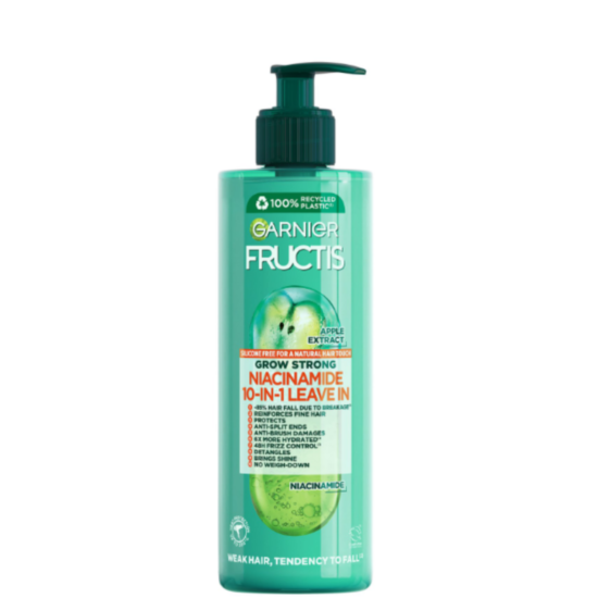 ГАРНИЕ ФРУКТИС КРЕМ БЕЗ ОТМИВАНЕ 10 В 1 GROW STRONG 400 МЛ е крем без отмиване, предназначен за тънка и късаща се коса. Кремът помага да се възвърне устойчивостта на косъма. Формулата му е обогатена с плодови екстракти и растителен глицерин, които подхранват и възстановяват еластичността на косата. Вложен е екстракт от ябълка, който хидратира косъма и му придава мекота и блясък. Добавени са екстракти от лимон, захарна тръстика, чай камелия и витамин В3 (ниацинамид), които оказват благоприятно действие върху състоянието на косата.