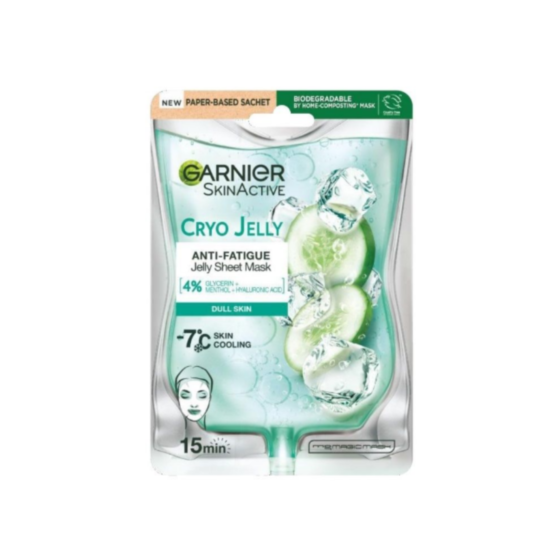 ГАРНИЕ ХАРТИЕНА МАСКА ХИАЛУРОНИК КРИО ДЖЕЛИ е хартиена маска за лице, която се отличава със своята специална формула с 4% глицерин, хиалуронова киселина и ментол. Тя ефективно премахва признаците на умора на лицето. За това спомага и иновативната -7° охлаждаща технология, изразяваща се в новаторската крио гелообразна текстура за хидратиране и освежаване на епидермиса.