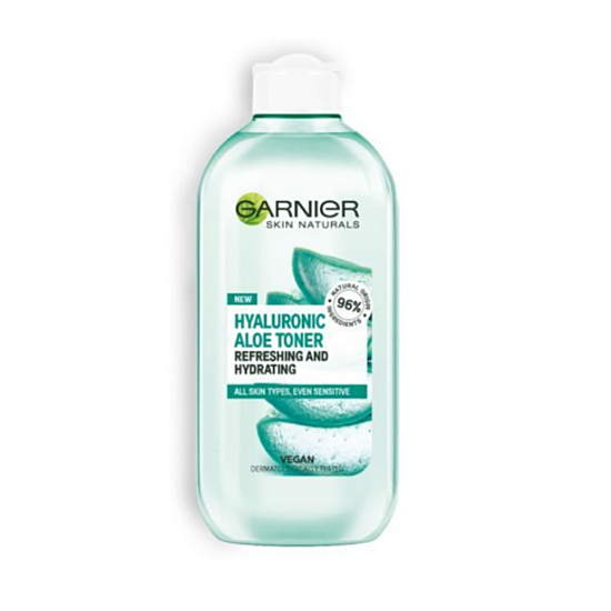 ГАРНИЕ ХИДРАТИРАЩ ТОНИК ЗА ЛИЦЕ С АЛОЕ ВЕРА И ХИАЛУРОНОВА КИСЕЛИНА 200 е освежаващ и хидратиращ тоник за лице, който почиства кожата, без да я изсушава. Той ефективно премахва остатъците от грим и замърсяванията. Неговата формула е обогатена с алое вера, което хидратира кожата. Притежава още противовъзпалителни и подхранващи свойства. В състава е добавена и хиалуронова киселина, която задържа влагата в кожата и действа подмладяващо. Тоникът е подходящ за всеки тип кожа, включително и чувствителна.