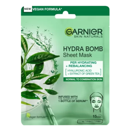 ГАРНИЕ ПАМУЧНА МАСКА ЗА ОСВЕЖАВАНЕ ЗА НОРМАЛНА И КОМБИНИРАНА КОЖА СЪС ЗЕЛЕН ЧАЙ 32ГР - Маската за лице е подходяща за нормална до комбинирана кожа. Напоена с концентриран серум, екстракт от зелен чай и хиалуронова киселина, които хидратират и детоксикират кожата, в допълнение към състава е включен глицерин, с противовъзпалително и овлажняващо действие. Памучната маска пасва гладко на лицето. След нанасяне порите са почистени и видимо намалени, а кожата остава мека и свежа.