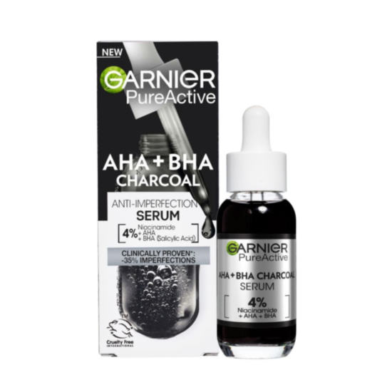 ГАРНИЕ ПЮР АКТИВ С АКТИВЕН ВЪГЛЕН СЕРУМ ПРОТИВ НЕСЪВЪРШЕНСТВА 30МЛ е серум предназначен за мазна кожа, склонна към несъвършенства. Комбинацията от концентриран [4%] ниацинамид + AHA + BHA намалява пъпките, черните точки и видимостта на порите. В същото време серума не оставя видими следи и лепкаво усещане. Съдържащият се AHA има изразен пилинг ефект, а BHA редуцира пъпките и разширените пори. Добавеният ниацинамид намалява зачервяванията и успокоява дискомфорта. Активният въглен от своя страна, почиства кожата и я матира. След употреба на серума, кожата става по-чиста, по-гладка и с по-равномерен тен. Дерматологично тестван продукт, който е подходящ и за чувствителна кожа.