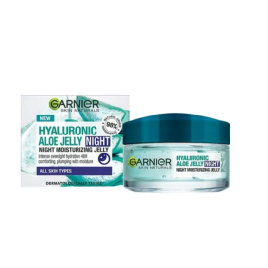 ГАРНИЕ СКИН НАТ ХИАЛУРОНИК НОЩНА ХИДРАТИРАЩА ГЕЛ-МАСКА С АЛОЕ ВЕРА 50МЛ e нощна хидратираща гел-маска, която е подходяща за всеки тип кожа. Комбинира свойствата на Хиалуроновата киселина (за дълбока хидратация), с алое вера (с изявени противовъзпалителни и подхранващи свойства) и арган (за по-мека и еластична кожа). Маската е съставена от 98% съставки от естествен произход. Осигурява интензивна до 48-часова хидратация, успокоява и възвръща обема на кожата. Дерматологично тестван продукт.