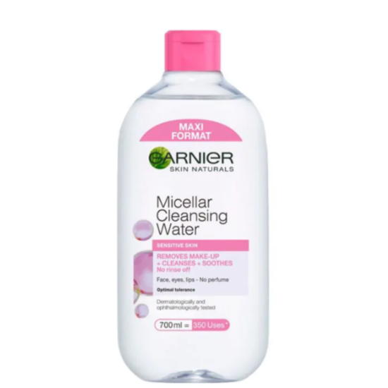 ГАРНИЕ СКИН НАТ МИЦЕЛАРНА ВОДА ЗА ЧУВСТВИТЕЛНА КОЖА 700МЛ - представлява иновативна мицеларна вода за чувствителна кожа за почистване на лице, която с лекота отстранява замърсяванията и грима по кожата, като я оставя свежа, гладка и мека. Тайната е в специалната съставка за почистване – активни мицели, които улавят всички замърсявания, себума и остатъците от грим без да е необходимо разтъркване. Само с един единствен жест лицето, очите и устните са добре почистени и готови за последващите им грижи. Дерматологично и офталмологично тестван.