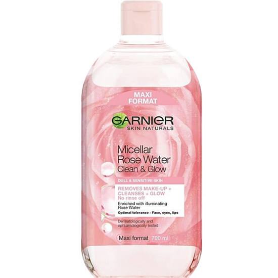 ГАРНИЕ СКИН НАТУРАЛНА МИЦЕЛАРНА ВОДА С РОЗОВО МАСЛО 700МЛ е мицеларна вода подходяща за всички типове кожа, дори и чувствителната. Тя сваля грима, премахва замърсяванията и придава блясък на кожата. Съдържа мицели, които почистват нежно кожата. Обогатена е с розова вода, която притежава хидратиращи, антибактериални и подмладяващи свойства. Дерматологично и офталмологично тествана.