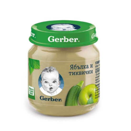 ГЕРБЕР 1107 ПЮРЕ ЯБЪЛКА И ТИКВИЧКА 6М+ 130ГР. е бебешко пюре, предназначено за деца на възраст над 6 месеца. То е натурален и висококачествен продукт, подходящ за захранване. Има приятен вкус и отлична текстура. Съдържа ябълка и тиквички, които са източник на витамини, минерали и хранителни вещества. Без глутен.