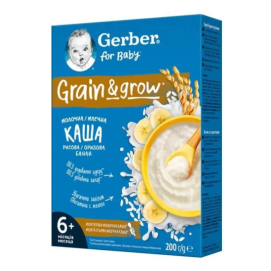 Gerber Оризова млечна каша с банан е без глутен, без добавена захар и е обогатена с желязо, за да поддържа нормалното когнитивно развитие на вашето дете. Оризовата каша на Гербер съчетава висококачествен ориз с витамини и минерали. Гербер Оризова млечна каша с банан е подходяща за децата след 6 месеца, питателна и вкусна.