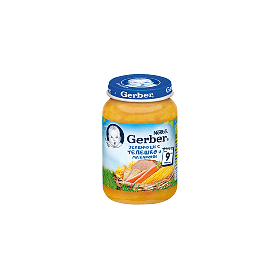 Пюрето Nestlé GERBER® Зеленчуци с телешко и макарони е предназначено за бебета след 9-ия месец. Продуктът е с подходяща за възрастта текстура, със ситно нарязани, меки парченца, подходящи за стимулиране на дъвкателните умения на бебето. Осигурява необходимите хранителни вещества белтъци, въглехидрати и мазнини. Пюрето представлява превъзходна комбинация от разнообразни зеленчуци, телешко месо и макарони. Съдържанието от моркови и ситно нарязан магданоз допринасят за изграждането на хранителни навици на детето чрез опитване на нови вкусове и текстури. Съставките са натурални и висококачествени, без добавени оцветители и