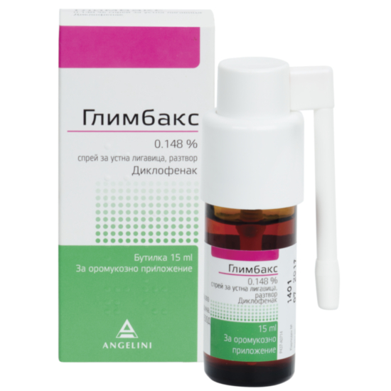 Глимбакс 0,148 % спрей за устна лигавица, разтвор Диклофенак на Angelini Pharma представлява нестероидно противовъзпалително средство, което се прилага в устната кухина (оромукозно приложение). Съдържащата се активна съставка Дикфлофенак има силно изразени противовъзпалителни и болкоуспокоителни свойства.