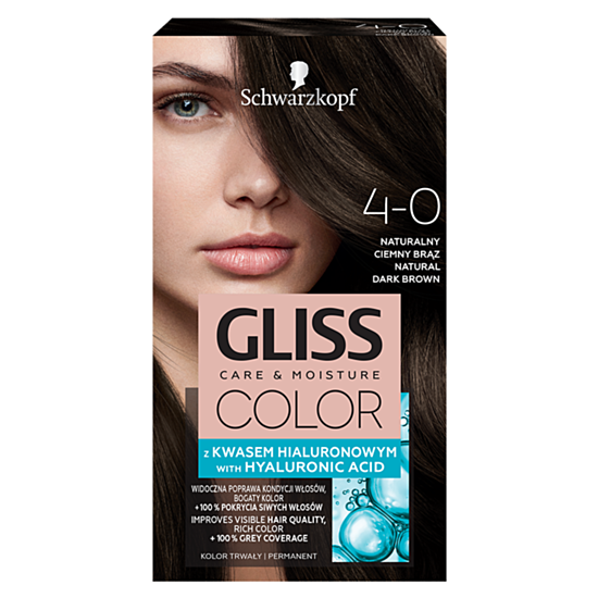 ГЛИС БОЯ ЗА КОСА С ХИАЛУРОНОВА КИСЕЛИНА 4-0 е иновативната боя, която оцветява косата и се грижи за нея по време на боядисване. Формулата е обогатена с активни съставки, които хидратират косата, предпазвайки я от изсушаване и увреждане. Вложените наситени пигменти осигуряват дълготраен и богат цвят, както и 100% покритие на сивите коси*. Това се дължи на специална система за грижа на цвета, която позволява на пигментите да проникнат дълбоко в косъма. Резултатът е здрава и лъскава коса.