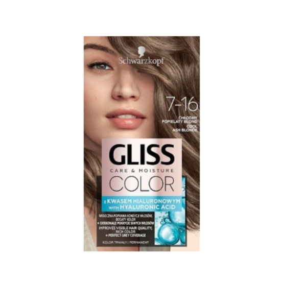 ГЛИС БОЯ ЗА КОСА С ХИАЛУРОНОВА КИСЕЛИНА 7-16 е иновативната боя, която оцветява косата и се грижи за нея по време на боядисване. Формулата е обогатена с активни съставки, които хидратират косата, предпазвайки я от изсушаване и увреждане. Вложените наситени пигменти осигуряват дълготраен и богат цвят, както и 100% покритие на сивите коси. Това се дължи на специална система за грижа на цвета, която позволява на пигментите да проникнат дълбоко в косъма. Резултатът е здрава и лъскава коса.