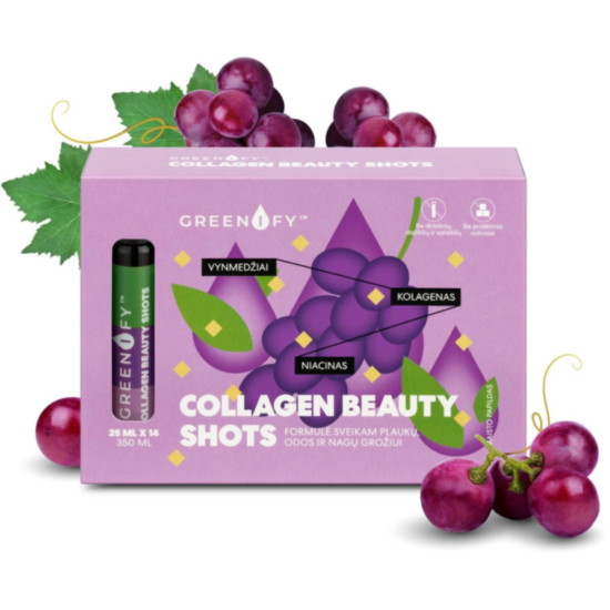 ГРИНИФАЙ КОЛАГЕН ЗА КРАСОТА ШОТОВЕ 25МЛ Х 14 е хранителна добавка обогатена с растителни екстракти, колаген и хиалуронова киселина за структурата на кожата, красотата на косата и ноктите. Поддържа нормалната пигментация на косата, кожата и ноктите. Защитава клетките от оксидативно увреждане и подпомага функцията на имунната система. Без добавена захар.