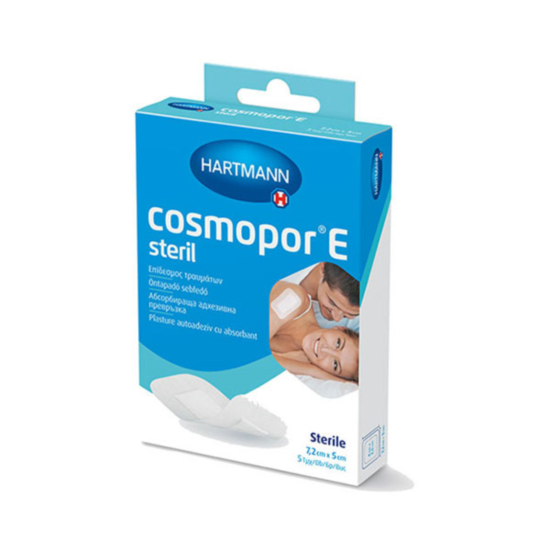 ХАРТМАН ПРЕВРЪЗКА КОСМОПОР Е СТЕРИЛНА 7.2/5СМ Х 5БР е стерилен пластир за предпазване и лечение на рани. Изработен от мек, нетъкан текстил, който приляга към контурите на тялото. Хартман Космопор Е Стерилен пластир е със силно абсорбираща подложка, която не залепва за раната и същевременно я предпазва от раздразнение и замърсяване. Космопор Е Стерилен пластир е изключително подходящ за предпазване и лечение на дълбоки рани и/или рани с риск от инфекция. Въздухопропусклив.