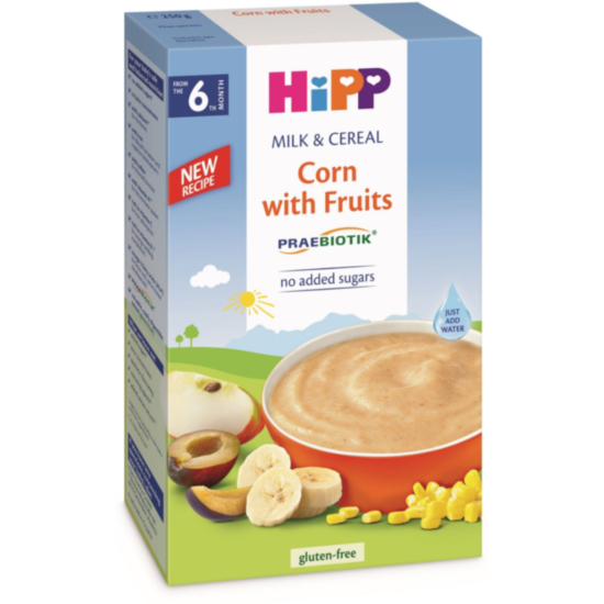 ХИП 2953 ИНСТАНТНА КАША ЦАРЕВИЦА С ПЛОДОВЕ 250ГР - с влакнини, съдържащи се и в майчиното мляко, имащи регулиращо действие върху червата. Царевичната каша не съдържа глутен, което предпазва от нежелани алергични реакции. Хип пребиотик инстантна каша царевица с плодове 6М+ 250 гр е преходна каша за бебета над 6 месеца. В нея са добавени плодове като банани, ябълки, сливи, които се възприемат добре от детския организъм, придават сладост и са със съдържание на витамини, минерали и омега-3 мастни киселини, поддържащи нормалното развитие на израстващия организъм.