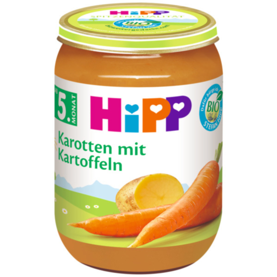 ХИП 4110 ПЮРЕ НЕЖНИ МОРКОВИ С КАРТОФИ 190ГР - Едно предложение на Хип за захранване на бебето с нежни моркови и свежи картофи, приготвени на пара и с приятен вкус. Подходящо за бебета след 5 месечна възраст. Естествен вкус, благодарение на вложените висококачествени продукти от сертифицирано биопроизводство на марката HIPP. Има затягащо дейтвие. Не съдържа: глутен, сол, захар, ароматизатори, оцветители, консерванти, свързващи вещества. Предлага се в опаковка от 190 г.
