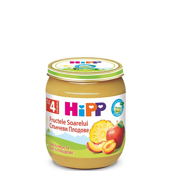 ХИП 4224 ПЮРЕ СЛЪНЧЕВИ ПЛОДОВЕ 125ГР - HIPP Хип био плодов десерт Слънчеви плодове - праскови, кайсии, ябълки и ананас. Предназназначен за лека закуска, десерт или междинно хранене на бебета над 4-месечна възраст. Може да се добавя към мляко или каша. Съдържа 100% плодове, без добавени мляко и захар. Без глутен и ГМО. Не съдържа оцветители, консерванти, ароматизатори и сгъстители.