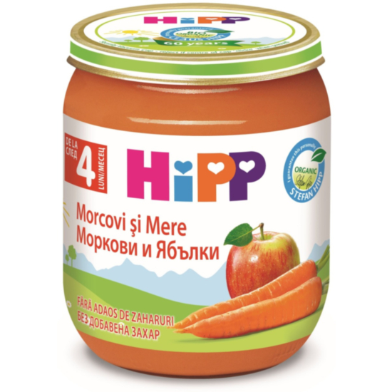 ХИП 4263 ПЮРЕ МОРКОВИ С ЯБЪЛКИ 125ГР - Био плодовото пюре от Hipp е подходящо както за десерт, така и за лека закуска между храненията. Може да се добавя към млякото или към различни каши. То не съдържа оцветители, ароматизатори, консерванти, сгъстители, както и ГМО и глутен.