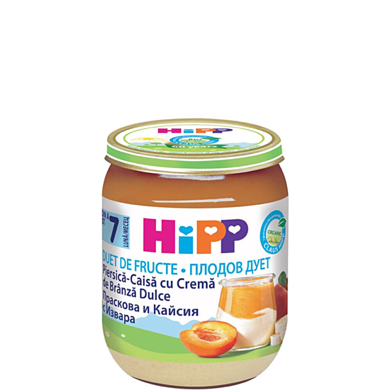 ХИП 5470 ПЛОДОВ ДУЕТ ПРАСКОВИ И КАЙСИИ С ИЗВАРА 160ГР - Био плодовото пюре от Hipp е подходящо както за десерт, така и за лека закуска между храненията. Плодовете в него са добити от биологично земеделие. То не съдържа оцветители, ароматизатори, консерванти, сгъстители, както и ГМО и глутен.