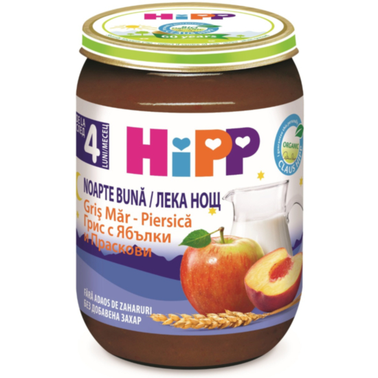 ХИП 5509 БИО КАША ЛЕКА НОЩ ГРИС,ЯБЪЛКИ,ПРАСКОВИ 190ГР - Млечната каша от Hipp е богата на калций и витамини. В нея няма добавена захар и ще засити детето, когато то е гладно. Кашата не съдържа консерванти, ароматизатори, ГМО и сгъстители.