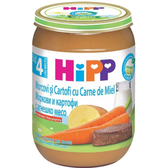 ХИП 6123 ПЮРЕ МОРКОВИ КАРТОФИ И АГНЕШКО 190ГР - Свежи моркови и картофи с крехко агнешко месо, финно смлени и с приятен вкус. Подходящо за бебета след 4 (четири) месечна възраст. Естествен вкус, благодарение на вложените висококачествени продукти от сертифицирано биопроизводство на марката HIPP. Има затягащо дейтвие. Не съдържа: глутен, сол, захар, ароматизатори, оцветители, консерванти, свързващи вещества.